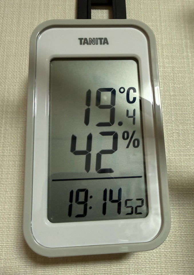 買ったのは安価だけどAmazonレビュー数20,000を超えて4.3の評価を得ていたタニタの温湿度計。小型でマグネット付きなので、ちょうど壁面に上手いこと貼り付けができてナイスな一品でした。